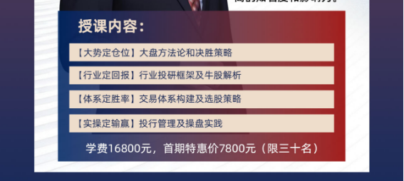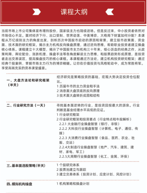 当前市场上市公司集体宣布增持股份,国家级主力也陆续进场。但是反过来,中小投资者依然对市场信心不足。面对经济下行、出口受制、世界动荡、中美博弈,大格局下财富如何分配?本课程从万亿级别主力的角度出发,剖析历次中国股市启动的原因和背景,建立股市政策面、资金面、技术面的研究框架,揭示主力机构反向操盘原理,通过逆向思维,帮助职业投资者建立操盘核心体系。课程建立十大模型,揭示了中国股市主力机构三十年来,呕心沥血的经典之作,从政策利用、舆论配合、涨跌机理、操盘手法等各角度解读主力思维,和股票趋势形成原理,是投资者走出交易误区,提高操盘技巧的核心课程。本课程通过方法论,建立机构投资研究框架;通过经典个股案例,掌握市场主力行为的博弈精髓。让你在价值投资与风格轮动中,成为常胜将军。享受高端充实的资本课堂盛宴。