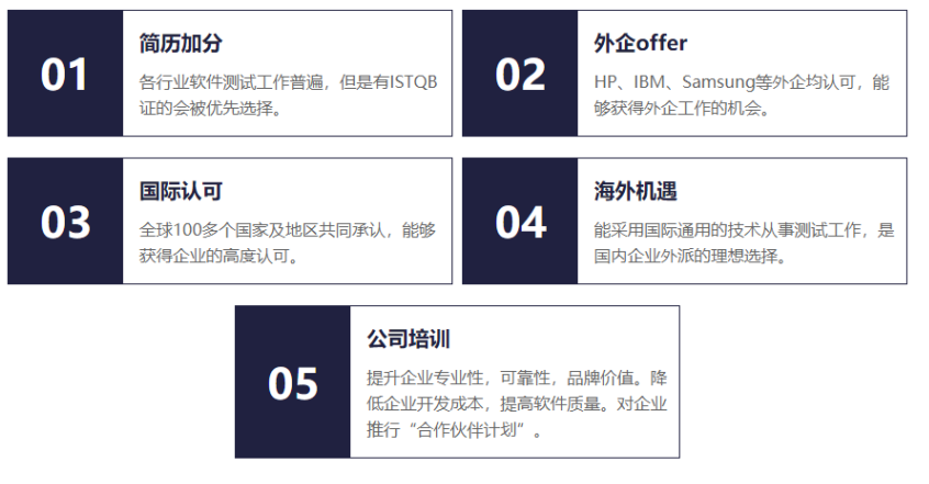 博为峰培训ISTQB认证培训课程除了帮助学员顺利获得ISTQB初级认证以外,还能使学员掌握统一标准的软件测试技术和实践方法,使多年学习和应用软件测试技术的知识和经验系统化,还可以获得国际化标准的职业发展框架,提高职场竞争力,赢得更多的竞争机会。