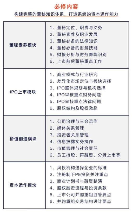 旨在帮助学员们建立系统全面的专业知识架构和战略性思维; 通过不同的学习方法,帮助学员们解决实际工作中所面临的问题,进而培养一批杰出的资本型董秘人才。