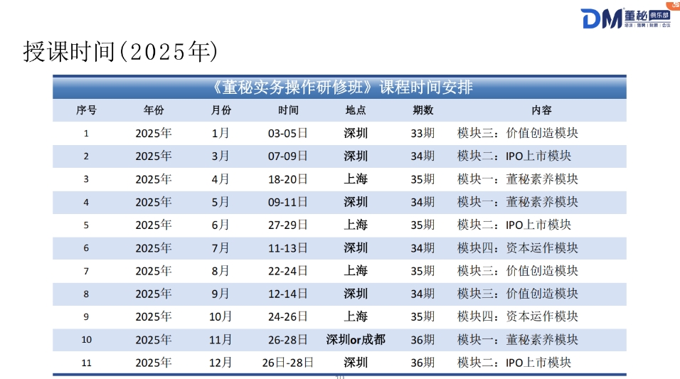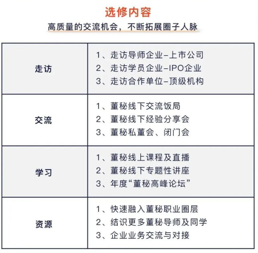 一位杰出的董秘,应具备跨行业、跨学科的知识和资源整合能力,董秘俱乐部凭借自身在资本服务、资源整合、人脉圈层、组织协调等方面的优势,整合最强大专家 阵容,开设《董秘实务操作研修班》线下课程。