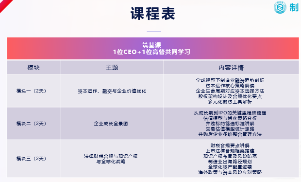 模块三(2天) | 法律财税合规与知识产权与全球化战略 | 财税合规要点讲解 上市法律合规框架搭建 知识产权布局及风险防范 制造业出海路径规划 全球化资产配置逻辑 海外政策与资本风险应对策略 |