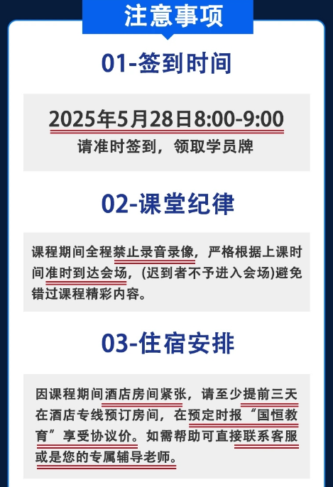 课程期间全程禁止录音录像,严格根据上课时间准时到达会场,(迟到者不予进入会场)避免错过课程精彩内容。