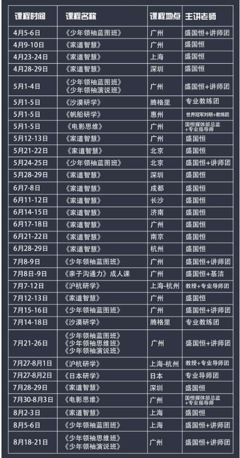 | 5月24-25日 | 《少年领袖蓝图班》 | 北京 | 盛国恒+讲师团 |