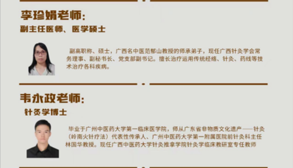 毕业于广州中医药大学第一临床医学院,师从广东省非物质文化遗产--针灸(岭南火针疗法)代表性传承人、广州中医药大学第一附属医院前针灸科主任林国华教授。现任广西中医药大学针灸推拿学院针灸学临床教研室专任教师