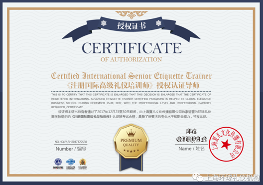 凡参加环球礼仪主办:礼仪培训师、形象设计师、仪态培训师班学员,均可获得环球礼仪授权资格证书。持有此证书,表明已参加环球礼仪课程认证,具备相应的水平和能力。持有此证书学员,环球礼仪可优先推荐授课机会、就业;可免费参加环球礼仪培训师的训练和辅导平台,可通过环球礼仪官网宣传包装塑造www.hqlypx.com。