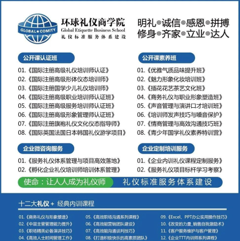 中国·环球礼仪是由上海夏礼文化传播有限公司独家运营的礼仪服务管理咨询培训公司。是一家集礼仪素养、礼仪培训、服务微咨询、企业定制化培训为一体的礼学教育机构。2008年开展礼仪咨询培训业务,参与奥运会、世博会、大运会礼仪培训项目,国内最早一批的专业礼仪培训机构;公司是人保部、美国认证协会认证授权,全国人才储备工作委员会认证授权机构。在全国拥有一批10年级的战略礼仪专家顾问团队,近300人的专家签约队伍。为企业提供礼仪服务体系微咨询解决方案,公司孵化企业国际礼仪培训师数目超过5000人!帮助企业打造最强大的礼仪文化智库生态圈,为企业量身定制卓越的礼学服务体系解决方案。