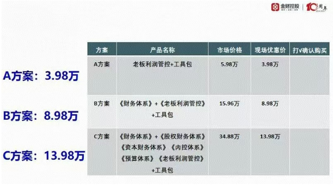 金财C方案班:《财务体系》《股权财务体系》《资本财务体系》《内控体系》《预算体系》《老板利润管控》+工具包 市场价格:34.88万 现场优惠价:13.98万