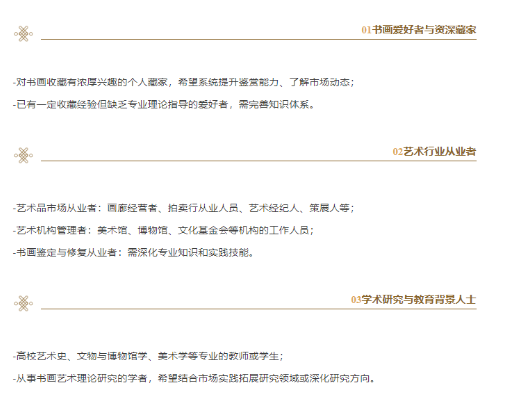 对书画收藏有浓厚兴趣的个人藏家,希望系统提升鉴赏能力、了解市场动态;