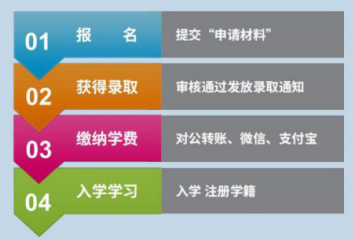 每月的月底 25 日前提交报名材料支付--提交注册申请并缴费--大学审核材料--出具录取通知书及学生卡--学生签收录取通知书--课程开始