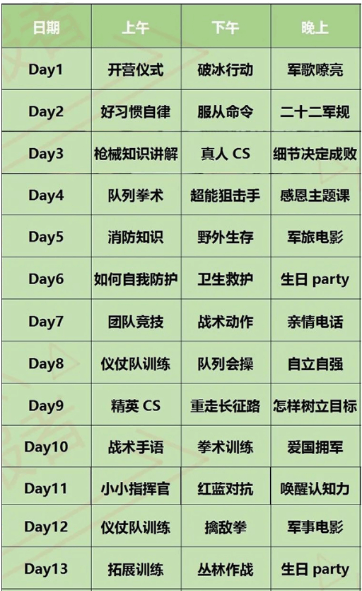 行为习惯(帮助孩子改掉拖沓懒散、自由散漫、专注力差、自控能力差等不良习惯;增强体质、锤炼意志,培养孩子独立、坚强、自信、勇敢等军人品格)。