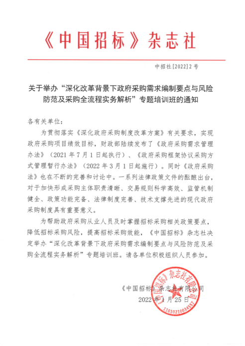 备注∶培训结束后统一颁发电子版结业证书,该证书统一编号,在中国招标投标网建库备查。