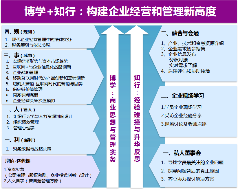 | 课程导读:旨在培养具有正确自我认知、通晓管理原理、掌握决策智慧和具有领导魅力的企业家和高级职业经理人,并通过老师的指导、同学的分享帮助学员获得“可繁殖的知识”以拓展经营管理者思维空间,为企业赢得管理红利,推动企业健康、可持续发展。 |