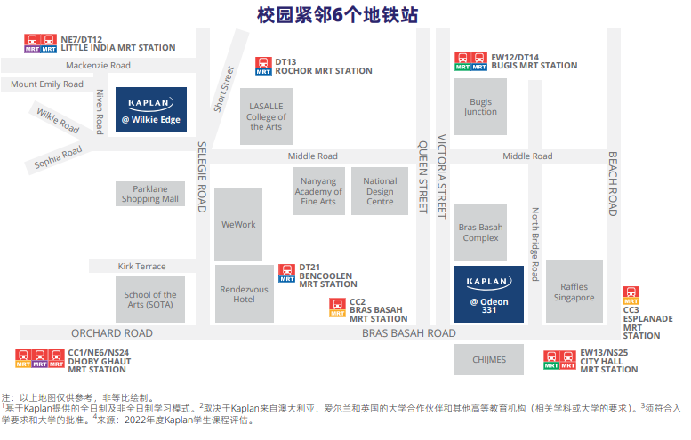 作为新加坡大型的私立教育机构,Kaplan在Wilkie Edge和Odeon 331的校区均位于城市商业中心,每个校区分别毗邻6个地铁站,横跨主要地铁线路。这些校区为学生提供良好和便利的学习环境,包括现代化的教室和计算机实验室、无线网络、学生休息区以及城市校园步行范围内的餐饮场所。