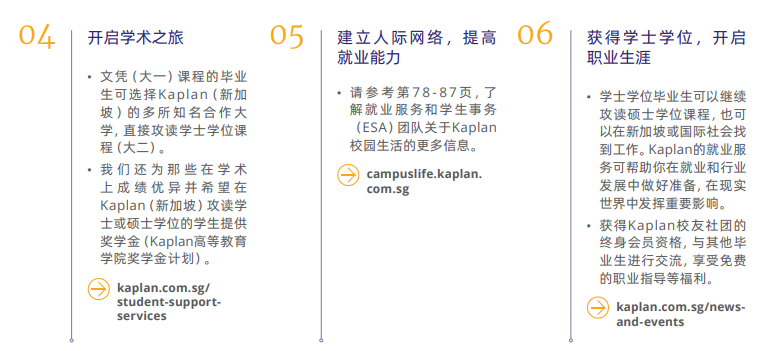 文凭(大一)课程的毕业生可选择Kaplan(新加坡)的多所知名合作大学,直接攻读学士学位课程(大二)。