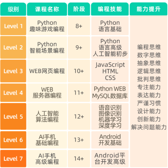 以Python编程语言为核心,注重培养学员创意思维、编程思维和综合能力。