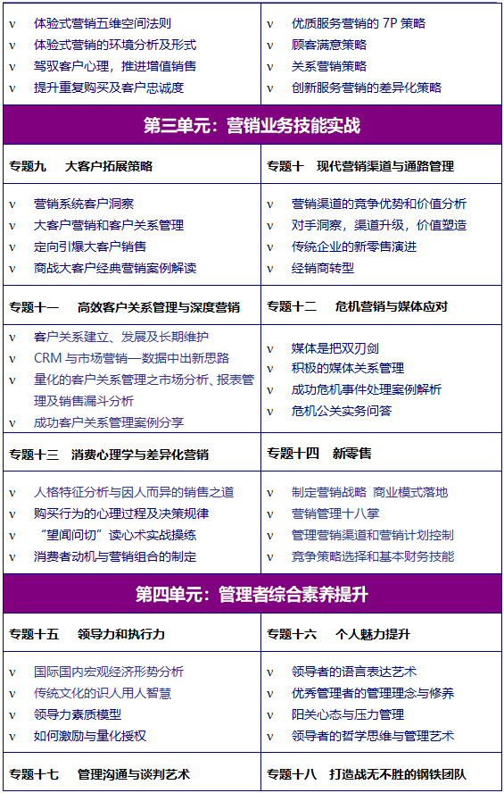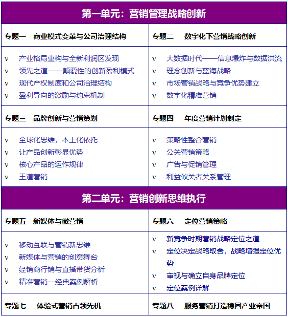 随着市场竞争的加剧和科学技术的发展,中国企业融入全球化的步伐在加快,带来前所未有的机遇和挑战。营销管理与创新作为企业的生命线更加凸显重要地位。企业高水平营销管理系统和创新营销策略建设,需要懂战略、会开拓、能决策、带队伍的营销高级管理者。