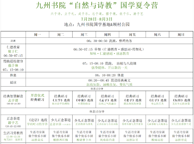 九州书院“自然与诗教”国学夏令营,以国学经典与诗教为核心,以自然教育、艺术教育、礼仪教育和生活教育为四翼,在这个夏令营里,孩子们将深度学习国学经典与诗词美文,学习中国文化中的大智慧,养正心性;在这里孩子们将接受书法、国画、健身等艺术教育,让孩子在这里学习体验以生命修养为核心的各种艺术形式;在这里孩子们将接受系统的礼仪教育,学会待人接物,如何遵守社交规范;在这里,孩子们在大自然里畅怀、探索、观察、运动、游戏,寓教于乐,涵养身心;在这里让孩子们体验生活教育,学厨艺,自己做菜,感受生活之趣。在这里,我们一起观影,聆听夏夜之声,赏夏夜的星空、明月,感受夏夜凉爽之风,自由分享所得所思。