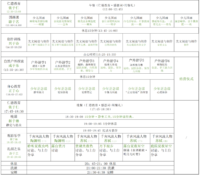 七、专业系统的课程。以国学经典和诗教为核心,以自然教育、艺术教育、生活教育和礼仪教育为四翼。动静相宜,内外兼修,室内课程和户外课堂相结合,听说读写相结合,鼓励思考、鼓励分享、鼓励写作、鼓励践行。悠游乐学,自学默化,变化气质,就这这个夏令营。