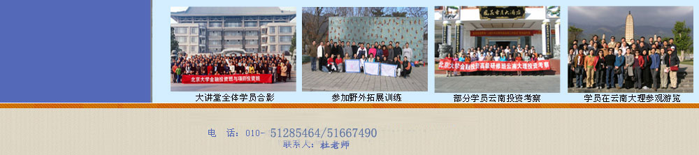 如遇时间调整,将另行提前通知到报名学员。学员报名交费后按北京大学的有关规定进行管理。 七.招生对象 1.金融证券、上市公司、银行、基金、资产管理、保险、期货、投资咨询、战略咨询公司等金融机构中高层管理人员; 2.大中型企业及民营企业董事长、总经理及主管投融资及财务的高层决策者; 3.会计师事务所、律师事务所、战略咨询公司的高级管理人员; 4.私募股权投资基金公司的项目负责人; 5.有志于从事金融投资工作的各界人士。 八.教务信息 1.授课地点:北京大学校内、上海、深圳等地 2.住宿:需住宿者由招生办提供校内外宾馆、招待所住宿信息,学员自主选择,费用自理。 3.学员管理:学员交费入学后,按北京大学有关规定进行管理。 九.报名程序 提交报名申请表→发入学通知书→交纳学费→ 报到入学 十.学费标准:38800.00元(含全部授课、讲座、证书、讲义等费用)。 用途: 学院《北京大学金融投资深度研修班》学费 汇款后请将银行汇款单传真到本班教务办公室。 十一.联系方式 通讯地址:北京大学 电话:010-62719488 传真:010-51413865 E-mail:chinalear@gmail.com |