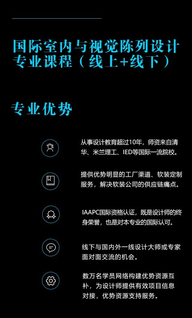 安排一次线下课程,可得“国际注册软装陈设设计师”、“国际注册室内设计师”、“国际注册家居设计师” 证。