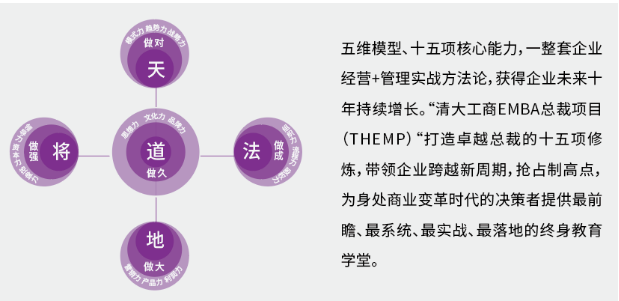项目创立至今已有十五载,三次升级三次迭代,历经清大工商EMBA1.0-6.0,陪伴和成就10000+企业家、高级管理者的成长、成熟与成功。15年的成功办学经验以及对中国企业家群体不断升级的学习需求的深度调研、深刻理解,全新定义总裁EMBA终身学习:独家研创 “道、天、地、将、法” 全新清大工商EMBA7.0课程体系。“道”模块解决做久之道,“天”模块解决做对之道,“地”模块解决做大之道,“将”模块解决做强之道,“法”模块解决做成之道。