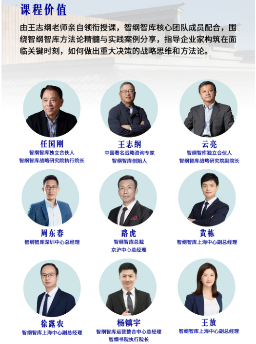 由王志纲老师亲自领衔授课,智纲智库核心团队成员配合,围绕智纲智库方法论精髓与实践案例分享,指导企业家构筑在面临关键时刻,如何做出重大决策的战略思维和方法论。