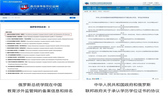 所有国外的大学文凭,中国教育部承不承认,要看这所学校有没有在“中国教育部涉外监管信息网”上是否有备案和公示,有就代表有招生资格,文凭得到承认,并在留学回国后能得到中国教育部的认证。俄联邦总统国家行政学院在中国教育部涉外监管信息网俄罗斯学校国家行政管理类中,编号01号。