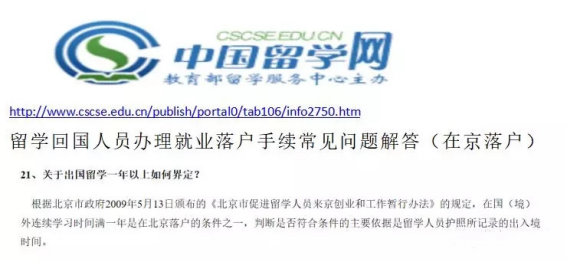 十 :教育部留学服务中心网上截图的北京市落户规定时间。